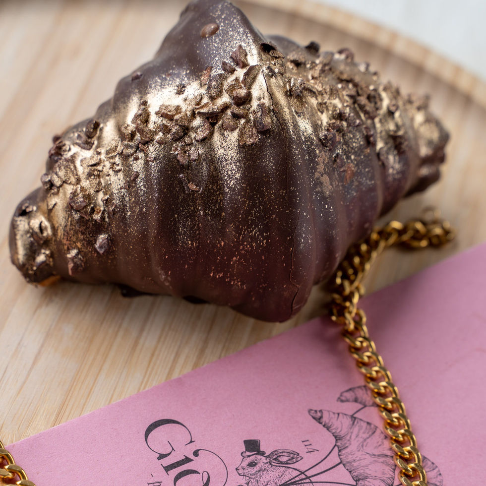 Croissant con cubierta de chocolate semiamargo, chips de chocolate y polvo de oro.