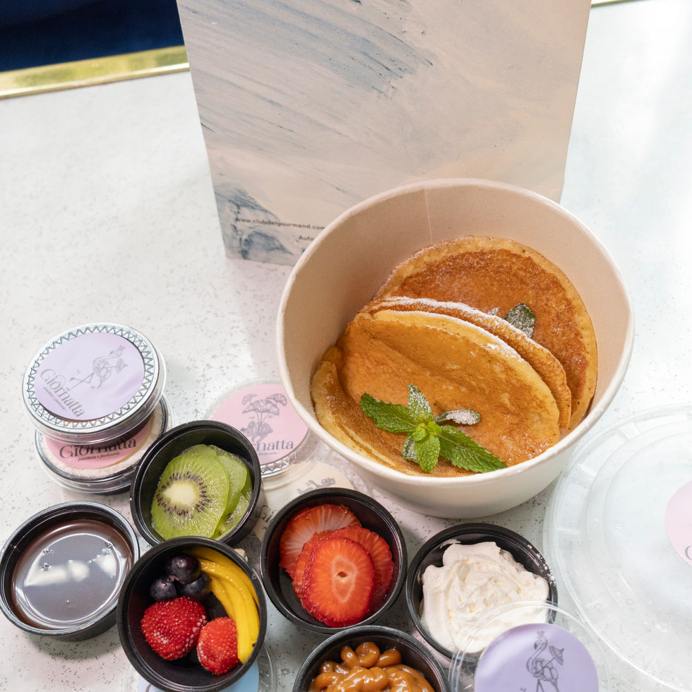 Disfruta de 2 unidades de pancakes rellenos de fruta, arequipe y crema chantilly.
